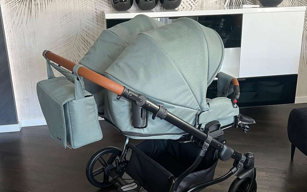 poussette double jumeaux côte-côte couleur vert d’eau 3 en 1 tout terrain