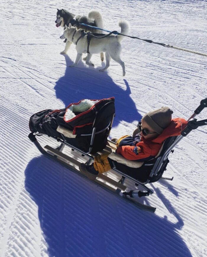 - De plus, la luge est équipée d’amortisseurs (en option), ce qui permet une certaine souplesse lorsque la route est irrégulière et surtout un confort pour l’enfant.